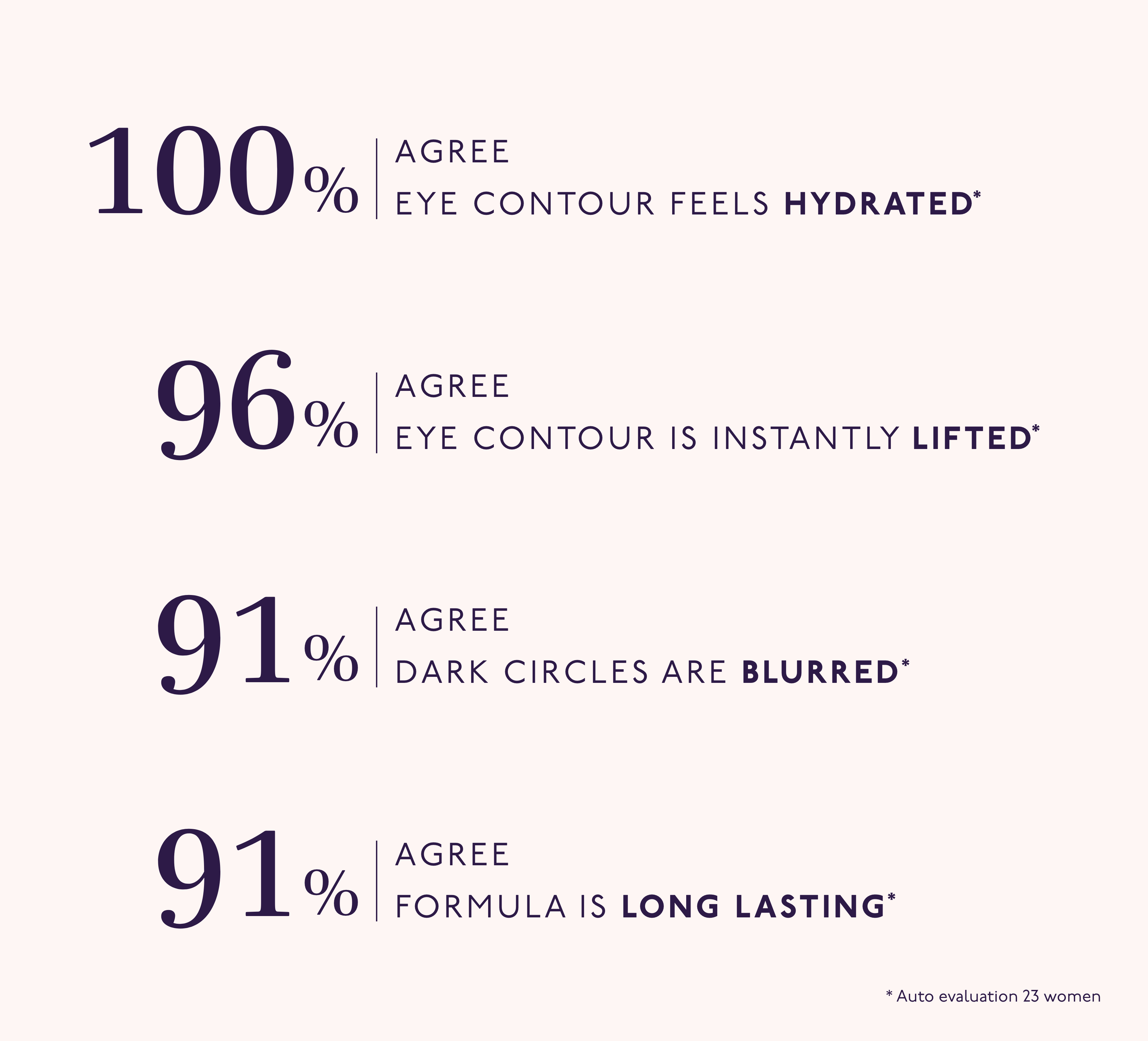 Based on clinical testing, skin is +32,9% hydrated - 100% participants have agreed that eye contour feels hydrated, whilst 96% agree that eye contour is instantly lifted, and 91% agree that dark circles are blurred and the formula is long-lasting.**